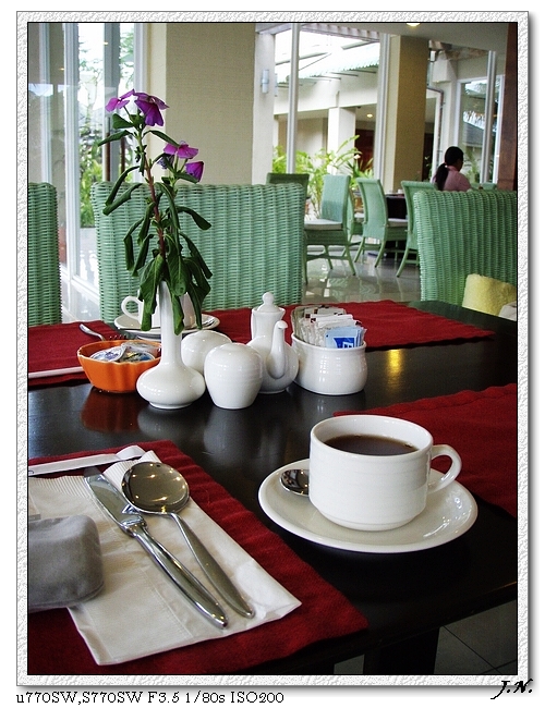 屋簷上長尾猴虎視眈眈的看著我們手中的餅乾,幸好他們除了食物之外對其他東西都沒興趣,我也才敢大辣辣地把相機擺在桌上。飯店有貼公告嚴禁住客餵食,因為這些長尾猴都是野生的,並不是飯店飼養的。餵食只會害了這些長尾猴。