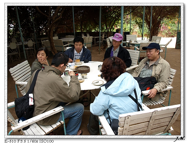 庭院裡有許多桌椅,集合時間還沒到,我們便聚集在這邊喝下午茶閒聊。飯店有提供免費的茶、咖啡和餅乾點心(當然也有馬賽人巡守以免點心被猴子給洗劫一空)。我順便去飯店的紀念品店買明信片來寫,再看看有沒有漂亮的地圖可以敗家。王小宇有蒐集地圖的習慣,每次出國總是會抱著一疊地圖回家。