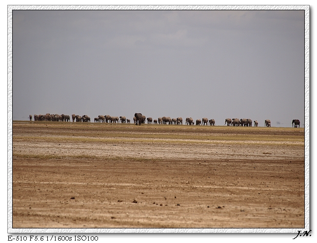總算通過了入口(國家公園內是禁止進入做生意的),擺脫了馬賽人。車子開始加速前往飯店,沒多久我們就看見遠處有著非常大的一群非洲象。這真是非常難得一見的景象,因為非洲象通常是由十至二十隻象組成一個家族,但這個象群卻總共有八十幾隻非洲象。領隊的鄭大哥也說這是他來肯亞這麼多年,第一次看到這麼大的象群。來肯亞遊獵,能不能看到動物得要靠運氣,看來我們這團的運氣很不錯,一開始就有好兆頭。