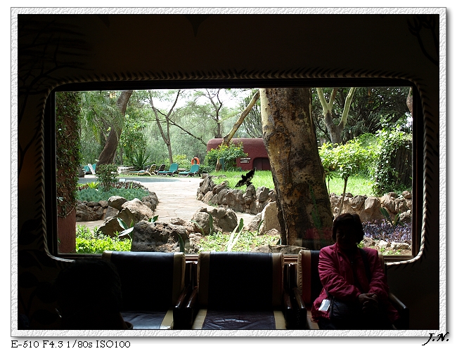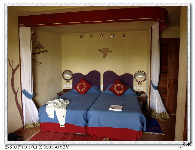 總算到達了我們住宿的Amboseli Serena Safari Lodge。這是Serena系統所經營的飯店,Serena所經營的飯店都具有相當高檔的水準,據說老闆是中東某位大亨。我們一進大門,就有服務生拿著毛巾和果汁(welcome drink)等著舟車勞頓的我們。沙塵惡魔的稱號不是叫假的,白白的毛巾一抹上臉馬上變得黃澄澄。國家公園內的飯店周圍都有保護措施,所以不會有肉食性動物跑進來侵擾,但住客嚴禁私自跑出飯店的範圍,因為一旦離開飯店的保護,外面就是完全野生的世界,手無寸鐵的人類只是肉食性動物眼中的一隻肥羊。