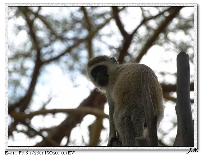 雖然飯店周圍有防護措施,卻阻擋不了這些攀爬高手。這些長尾猴動作敏捷,是打家劫舍的狠角色,也是我們得緊閉門窗的主因。我曾親眼看到一隻長尾猴無預警地衝向旅客,瞬間搶走她手上咖啡杯旁擺放的餅乾再逃逸無蹤(那位女士當場花容失色、驚聲尖叫)。因此Amboseli飯店有雇用一些馬賽人巡邏餐廳四周,以免長尾猴肆虐騷擾遊客。